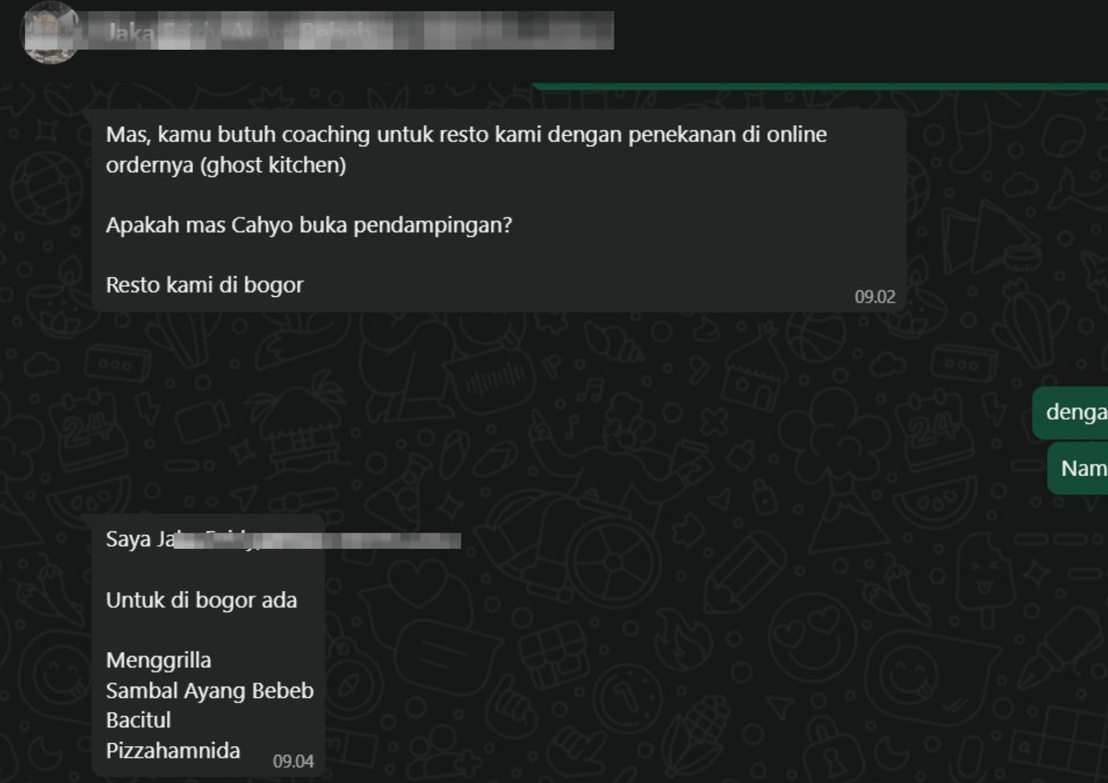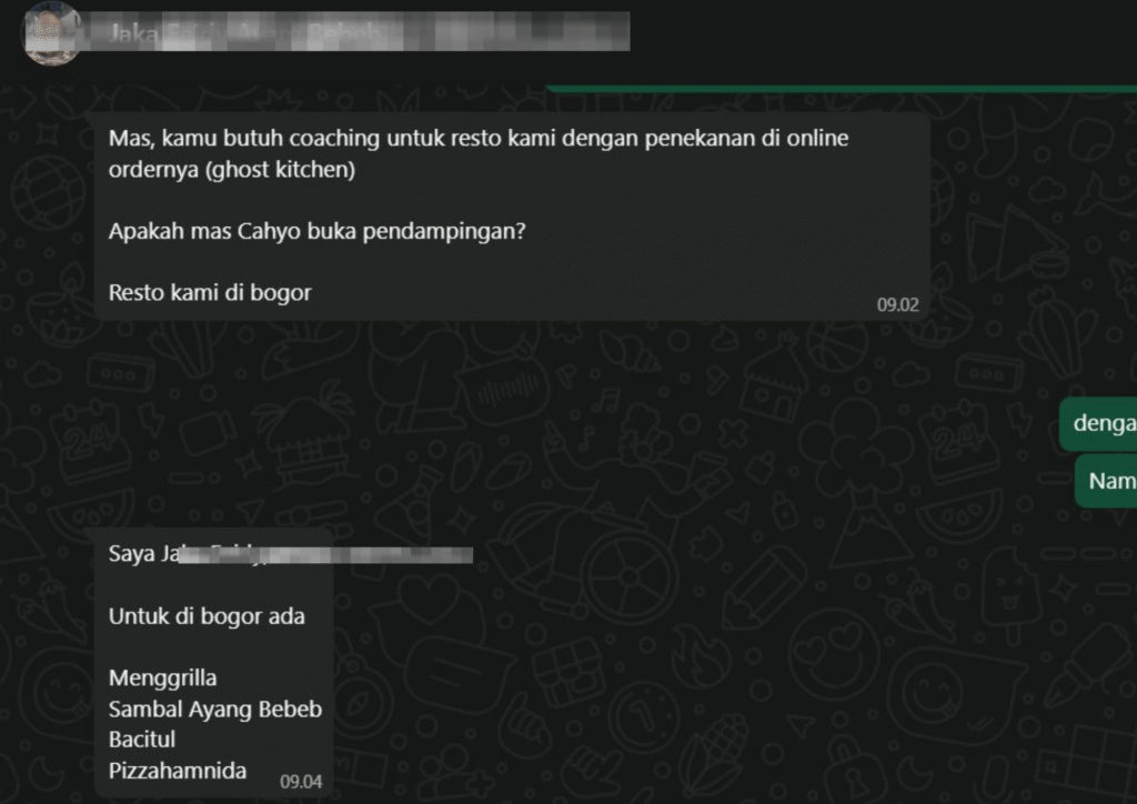 Assalamualaikum, salam kenal pak. Saya mas Jana. Terima kasih sebelumnya buat konten” business insight nya pak. Sangat menginspirasi dan buat bahan belajar yg bermanfaat. Kebetulan saya juga sedang merintis usaha kuliner pak, modelan warung serba sambal gitu, sudah berjalan hampir 5tahun. Saat ini baru ada 2 cabang, sudah cukup viral, banyak diliput stasiun tv dan baru”ini saja saya membuka diri untuk kembangin peluang kemitraan (arahnya mau franchise).